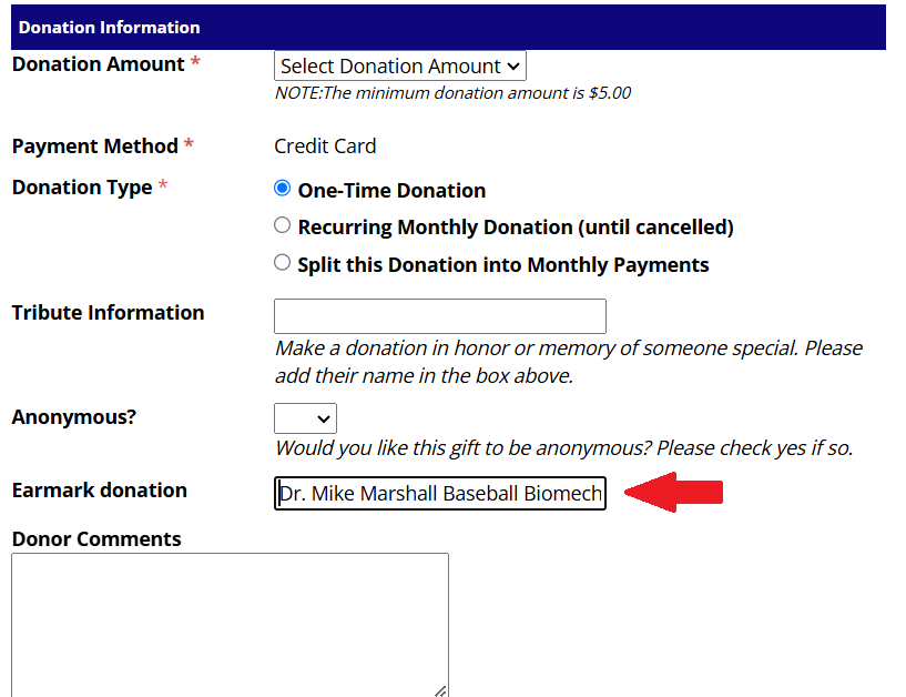 IMPORTANT: To ensure your donation goes to this charitable fund, the EARMARK DONATION field on SABR’s online donation form needs to be filled in with Dr. Mike Marshall Baseball Biomechanics Research Award. Please refer to the image below to see where the field is located on SABR’s form.